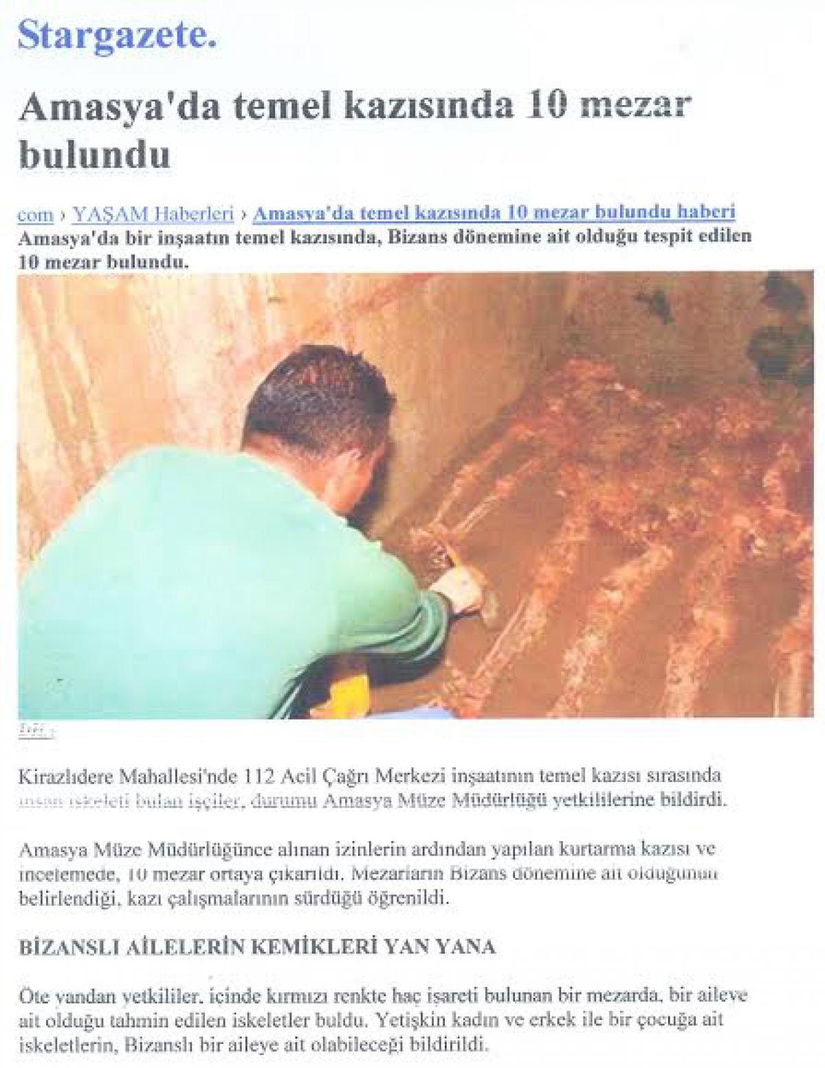 Μια από τις τελευταίες πραγματικά εντυπωσιακές ανακαλύψεις είναι ένα χριστιανικό βυζαντινό νεκροταφείο που ανακαλύφθηκε πριν από λίγο καιρό στην πόλη της Αμάσειας, στον σημερινό Πόντο της Μικράς Ασίας, σαν άλλο ένα δείγμα της ελληνορθόδοξης παρουσίας στην περιοχή επί πολλούς αιώνες. Σύμφωνα με τα τουρκικά αποκαλυπτικά δημοσιεύματα, η σκαπάνη των Τούρκων ανακάλυψε ένα βυζαντινό νεκροταφείο που μάλιστα περιέχει δέκα σωρούς νεκρών με το εντυπωσιακό στοιχείο ότι είχαν ταφεί ο ένας δίπλα στον άλλο, γεγονός που μαρτυρεί την στενή σχέση ίσως και συγγένεια που είχαν μεταξύ τους όταν βρίσκονταν εν ζωή. Το σπάνιο αυτό νεκροταφείο, ανακαλύφθηκε στην περιοχή Kirzalıdere Malallesi της Αμάσειας, σύμφωνα με τις δηλώσεις του διευθυντή του τοπικού μουσείου. Όπως ανέφερε ο εκπρόσωπος του τοπικού μουσείου, οι σωροί που αναδύθηκαν μετά από τόσους αιώνες στην επιφάνεια, ανήκουν στην βυζαντινή εποχή και πρόσθεσε πως οι ανασκαφές στην περιοχή θα συνεχιστούν με την προσδοκία της ανακάλυψης και άλλων σπάνιων ευρημάτων από την ελληνορθόδοξη βυζαντινή παρουσία, που είχε κυριαρχήσει επί πολλούς αιώνες σε όλη την ευρύτερη περιοχή.