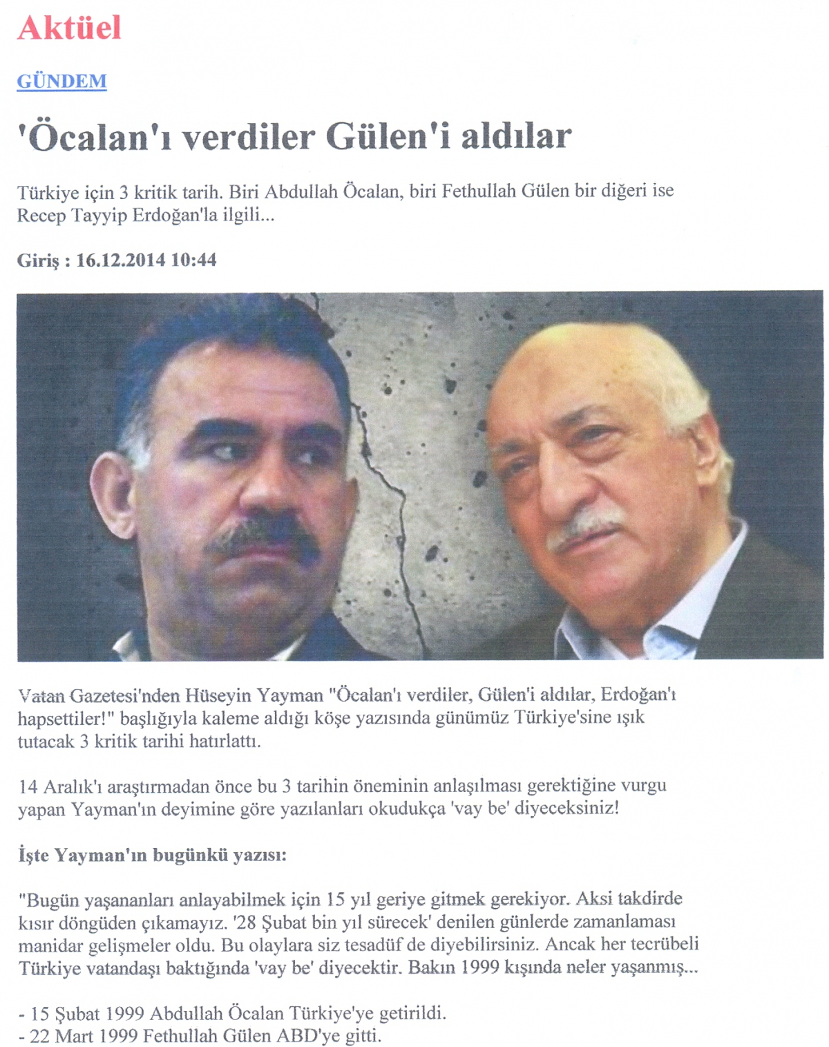 Η απορία αυτή του Ετσεβίτ, αλλά και τα πολλά αναπάντητα μέχρι σήμερα ερωτήματα για το ποιες μυστικές υπηρεσίες είχαν πρωτοστατήσει στην σύλληψη και παράδοση του Οτσαλάν στους Τούρκους, απαντήθηκε σχεδόν ένα μήνα μετά, σύμφωνα με τις σημερινές εντυπωσιακές αποκαλύψεις της τουρκικής επιθεώρησης, Aktüel και της τουρκικής εφημερίδας, Vatan. Στις 22 Μαρτίου 1999, ο γνωστός Τούρκος ισλαμιστής ηγέτης, Φετουλάχ Γκιουλέν, που έχει και σήμερα παρά τις συνεχείς διώξεις των οπαδών του από το καθεστώς του Ερντογάν μεγάλη επιρροή στην Τουρκία, φεύγει για τις ΗΠΑ ενώ εκκρεμεί ένταλμα σύλληψης του από τις τουρκικές αρχές ασφάλειας και του στρατιωτικού κατεστημένου που τον έκρινε σαν απειλή για το τουρκικό καθεστώς. Τότε είχαν γραφεί πολλά γιατί ο Εστεβίτ άφησε τον Γκιουλέν να φύγει στις ΗΠΑ χωρίς να τον συλλάβει, όπως απαιτούσαν τότε οι κεμαλικοί στρατηγοί με τους οποίους ο Ετσεβίτ συντάσσονταν σε γενικές γραμμές.