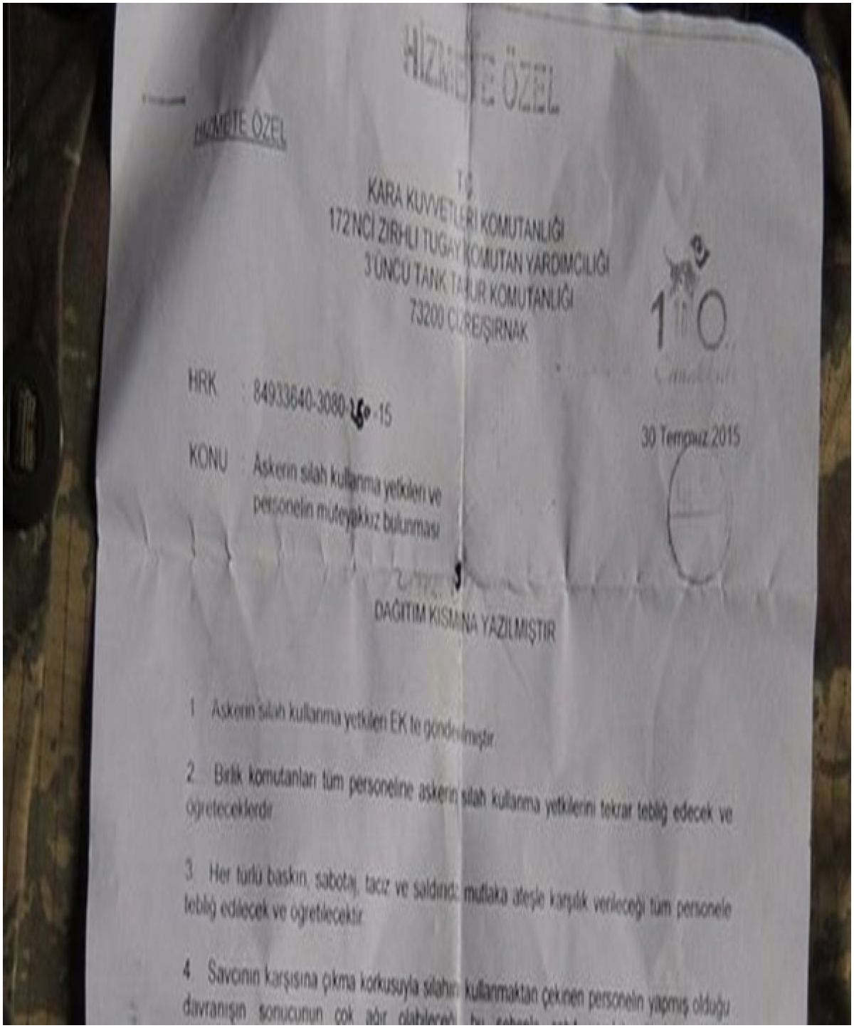 Το υπ’αριθμόν 84933840-3000-350-15,απόρρητο έγγραφο παραδόθηκε στην 172η Τουρκική ταξιαρχία στις 30 Ιουλίου του 2015 και εκδόθηκε απο την Τουρκική στρατιωτική διοίκηση σε Cirze/Sirnak.To 6 σημείων έγγραφο δίνει κατευθυντήριες γραμμές στους διοικητές ώστε »να ενθαρρύνουν τους στρατιώτες τους να χρησιμοποιούν τα όπλα κατά πολιτών,χωρίς να έχουν άγχος πως θα τους τιμωρήσουν!!!