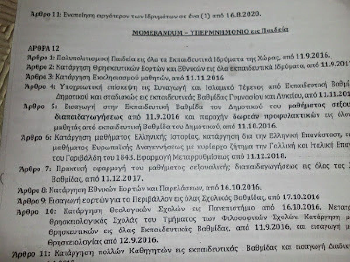 Άρθρο 6: Κατάργηση μαθήματος Ελληνικής Ιστορίας, κατάργηση για την Ελληνική Επανάσταση, εισαγωγή μαθήματος Ευρωπαϊκής Αναγεννήσεως με κυρίαρχο ζήτημα την Γαλλική και Ιταλική Επανάσταση του Γαριβάλδη του 1843. Εφαρμογή Μεταρρυθμίσεως από 11.12.2018.