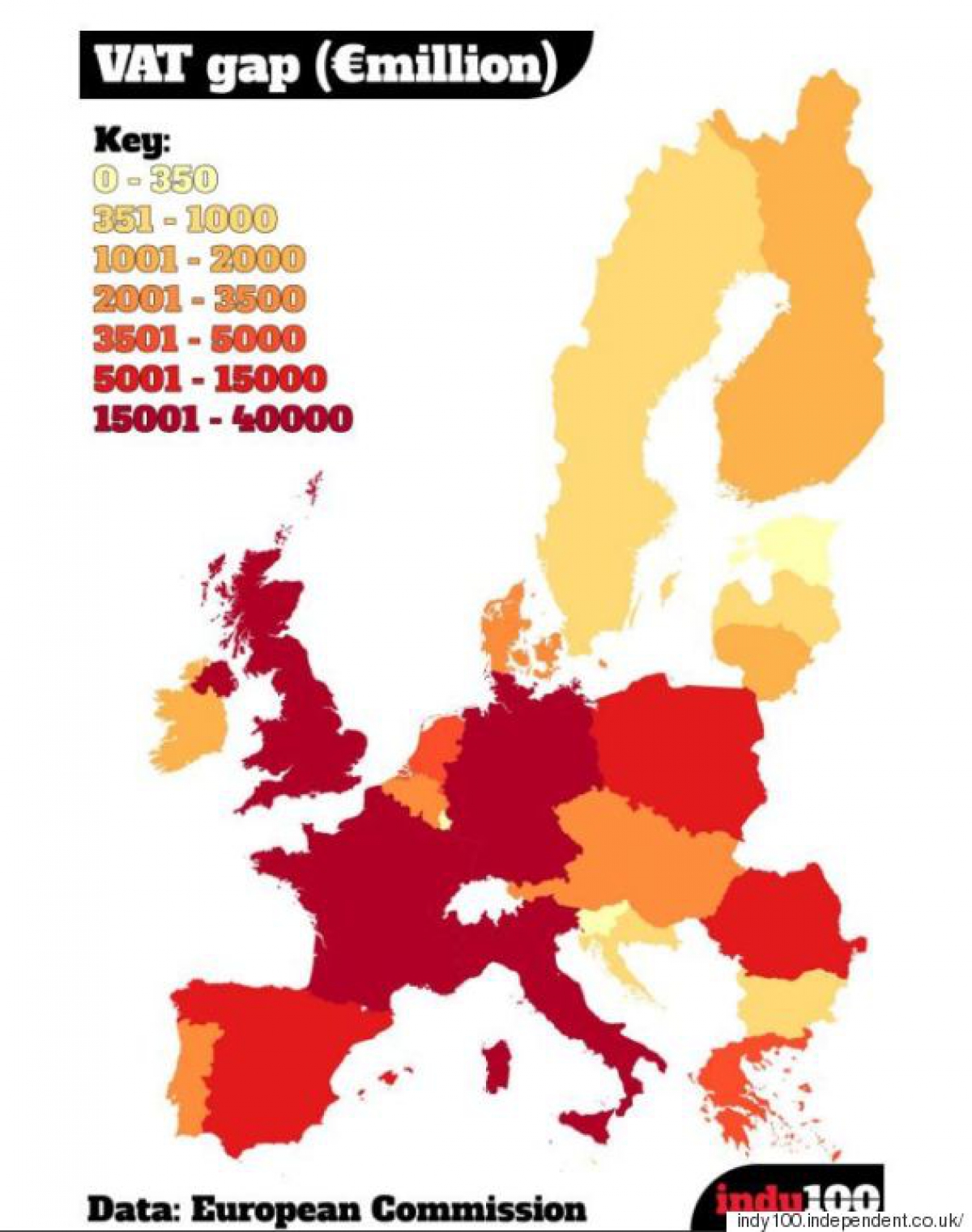 Η Κομισιόν δημοσίευσε πρόσφατα στοιχεία για το έλλειμμα του ΦΠΑ στα κράτη μέλη της ΕΕ, βάσει στοιχείων του 2014. Και ο Independent δημιούργησε ένα χάρτη.