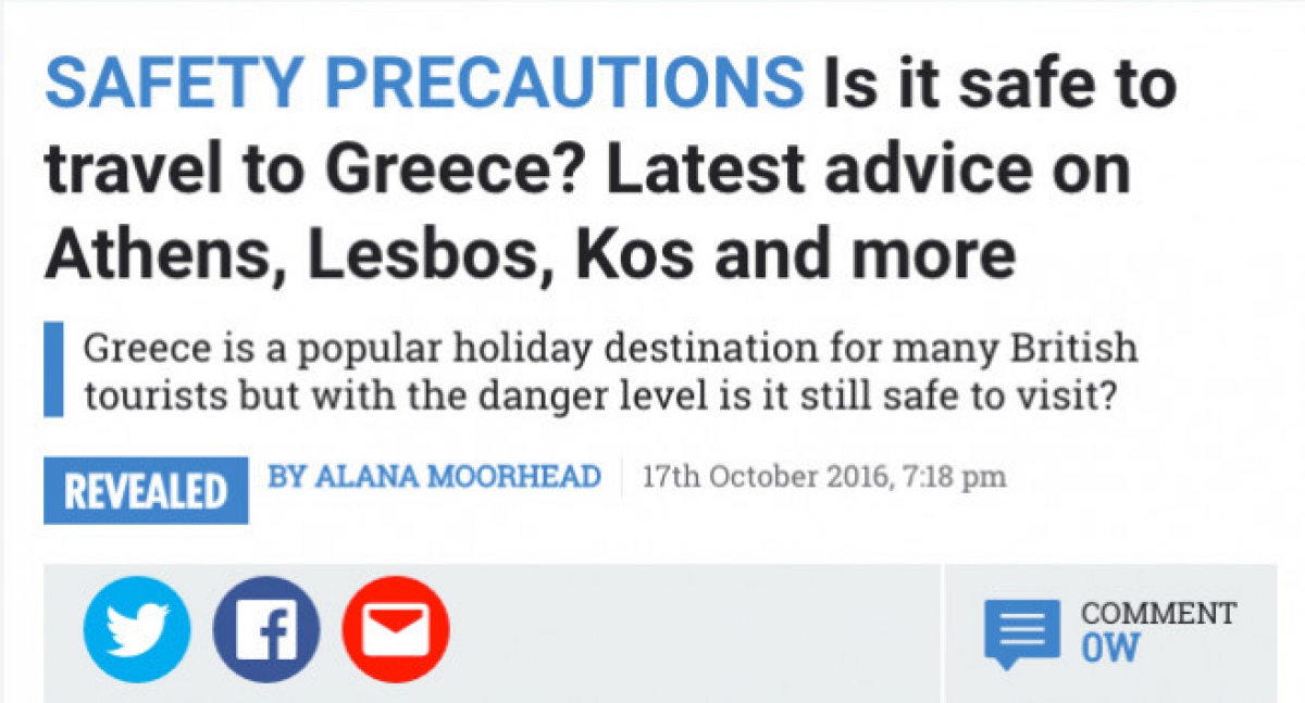 Η εφημερίδα SUN που διαβάζεται από εκατομμύρια σε όλο τον κόσμο αλλά και την Βρετανία, φιλοξένησε στις 17/10/2016 ένα άρθρο που μόνο ύποπτο μπορεί να χαρακτηρισθεί. Κι αυτό, γιατί παρουσιάζει μια χώρα που σχεδόν είναι σε πόλεμο με μια πρωτεύουσα που κινδυνεύει κανείς στους δρόμους της, λόγω διαδηλώσεων. Επίσης, αναφέρεται σε νησιά της χώρας τα οποία έχουν δεχθεί πρόσφυγες και μετανάστες και αφήνει να εννοηθεί ότι μπορεί να κινδυνεύσει ένας τουρίστας από αυτούς!