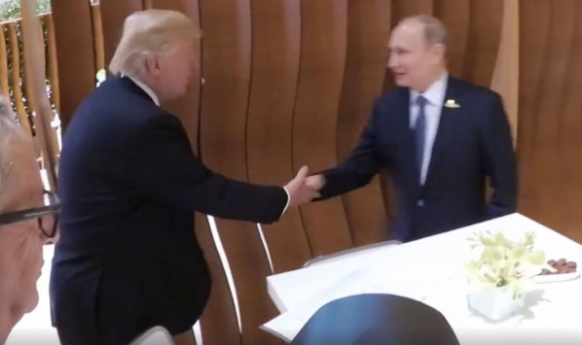 Υπό το βλέμμα του προέδρου της Κομισιόν Ζαν Κλοντ Γιούνκερ και του προέδρου του Ευρωπαϊκού Συμβουλίου Ντόναλντ Τουσκ, Τραμπ και Πούτιν αντάλλαξαν την πρώτη τους χειραψία και τα πρώτα τους... χαμόγελα!