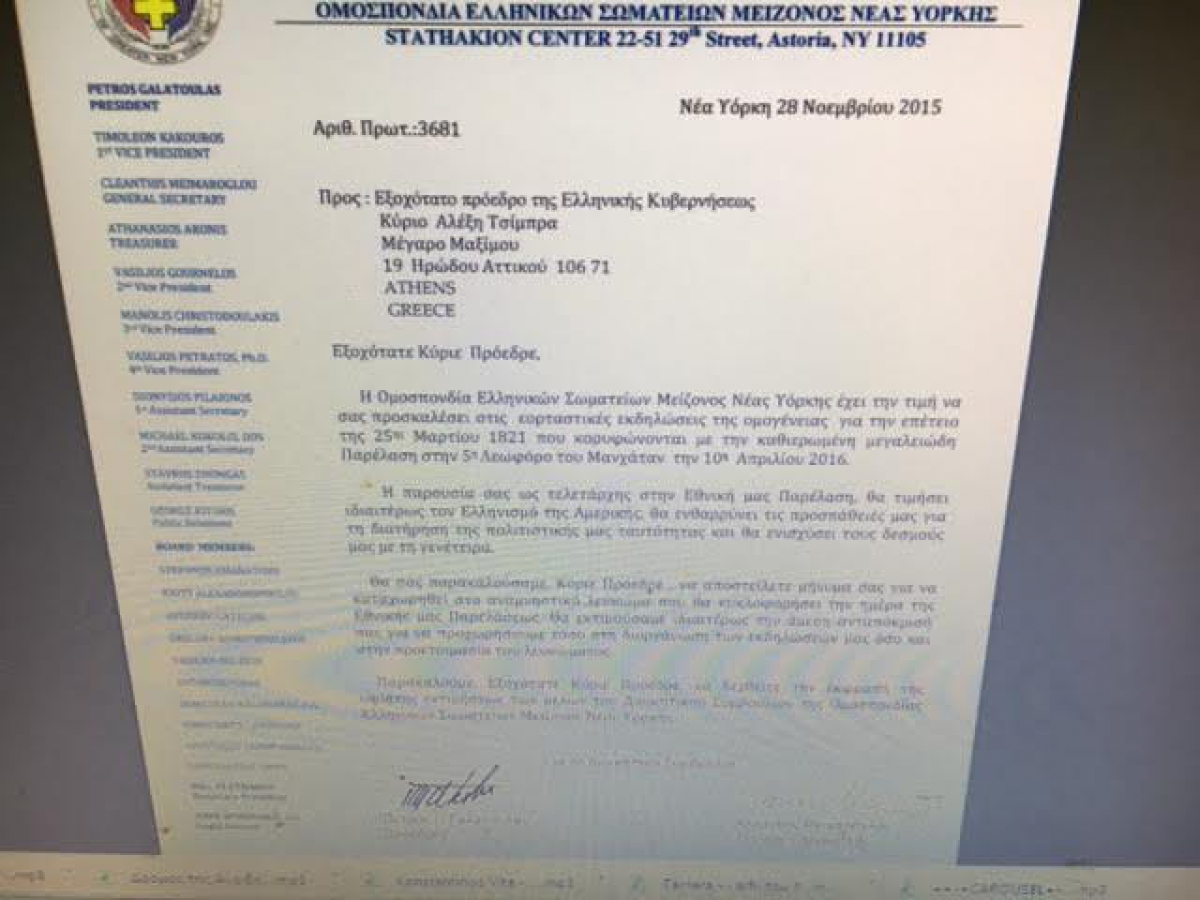 Aνακοινώθηκαν δια στόματος του Προέδρου της Ομοσπονδίας Ελληνικών Σωματείων Μείζονος Νέας Υόρκης Πέτρου Γαλάτουλα οι 3 Τελετάρχες της Παρέλασης του Ελληνισμού στην 5ηΛεωφόρο την 10ηΑπριλίου 2016.