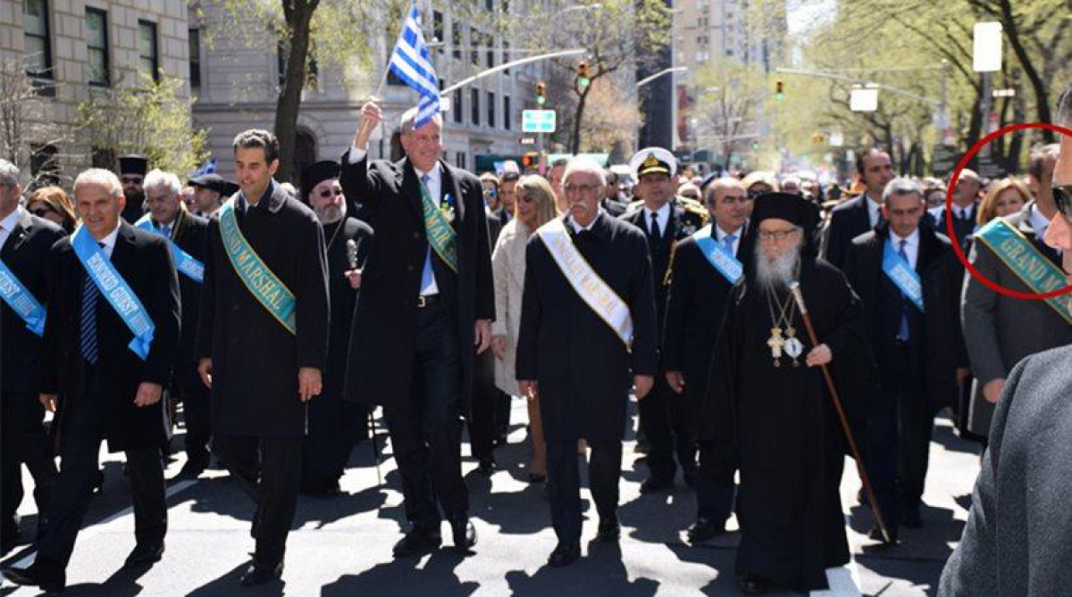 Η ακόλουθη φωτογραφία ήταν κι αυτή μια από τις 22 που δημοσιοποιήθηκαν από το υπουργείο Εθνικής Άμυνας. Ο πανύψηλος δήμαρχος Νέας Υόρκης Μπιλ ντε Μπλάζιο κρατά μια ελληνική σημαία. Εξ ευωνύμων του περπατά ο κ. Βίτσας. Αριστερά του αναπληρωτή υπουργού Άμυνας ο αρχιεπίσκοπος Αμερικής Δημήτριος. Ποιος να το φανταζόταν -αν είχε σαν μοναδική πηγή ενημέρωσης το γραφείο του κ. Βίτσα- ότι παραδίπλα στον Δημήτρη Βίτσα βρίσκεται ο Κυριάκος Μητσοτάκης;