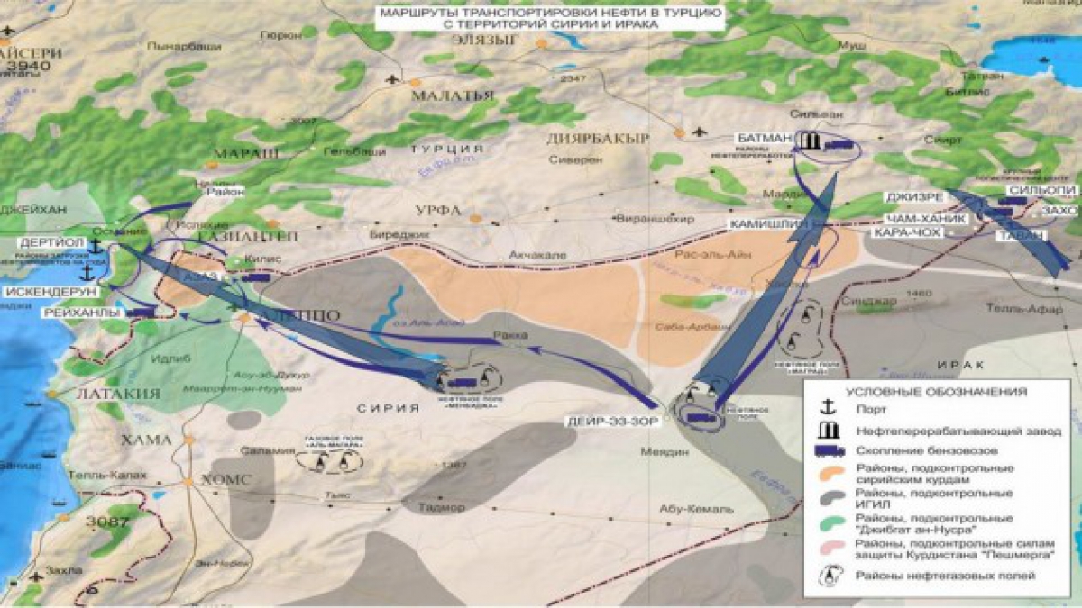 Σύμφωνα με τους Ρώσους, ένα από τα μεγαλύτερα κέντρα εξόρυξης πετρελαίου είναι η πόλη Ντιερ εζ Ζορ. Η διαδρομή ξεκινά από την ανατολική Συρία και καταλήγει στο διυλιστήριο της Μπατμάν στην Τουρκία. Τους τελευταίους δυο μήνες, απ’ όταν δηλαδή ξεκίνησαν οι αεροπορικές επιδρομές της Ρωσίας στη Συρία, έχουν καταστραφεί 32 μονάδες παραγωγής του ISIS και 11 διυλιστήρια. Οι τρεις διαδρομές είναι: η δυτική που οδηγεί σε τουρκικά λιμάνια στη Μεσόγειο, η βόρεια, στο διυλιστήριο της Πατμα και η ανατολική, στο Καζρί.