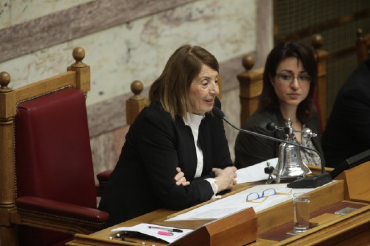Αντίθετα η προεδρεύουσα και Αντιπρόεδρος της Βουλής Τασία Χριστοδουλοπούλου ακούστηκε να της αντιλέγει πως «το επίπεδο σας έχει πέσει υπό του μηδενός.... Έχει περάσει ένας χρόνος (από τότε που είχε πει για τους μετανάστες ότι τι κάνουν στο κέντρο της Αθήνας, λιάζονται...) και εσείς συνεχίζεται το ίδιο. Αυτό το νομίζεται ότι επηρεάζει την κοινωνία... Η κοινωνία σας έχει κατατάξει εδώ που βρίσκεται ( ως κόμμα στην Αντιπολίτευση). Αν θέλετε περάστε εκτός αιθούσης...»