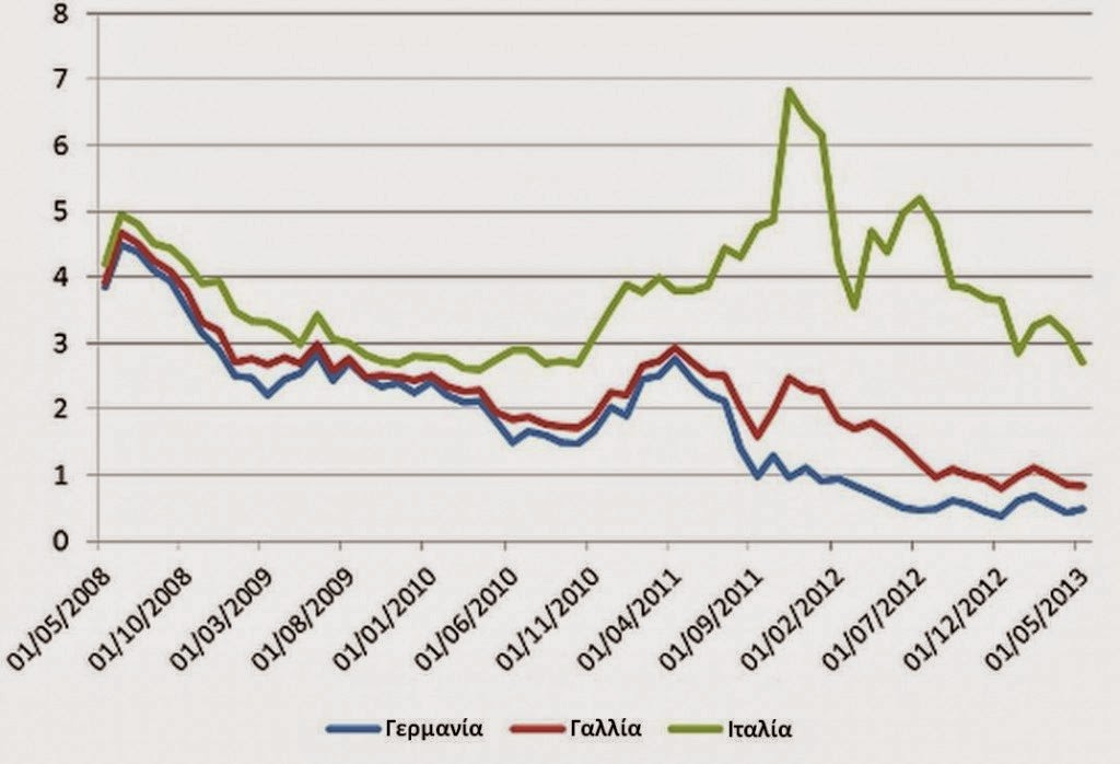 Και ένα μικρό παράδειγμαΤην ώρα που η Ελλάδα δεν μπορεί να βγει στις αγορές και οι αποδόσεις των επιτοκίων της κυμαίνονται σε διψήφια ποσοστά, η Γερμανία χρησιμοποιεί την κρίση στην ευρωζώνη, για να αναχρηματοδοτήσει το χρέος της που λήγει μετά το 2024, δίνοντας στους επενδυτές που προτιμούν την «ασφάλεια» των γερμανικών ομολόγων αποδόσεις χαμηλότερες από την παραγωγικότητα της Γερμανίας και ίσως και από τον μελλοντικό πληθωρισμό, που θα προκύψει αναπόφευκτα στα πλαίσια των διεθνών οικονομικών κύκλων.