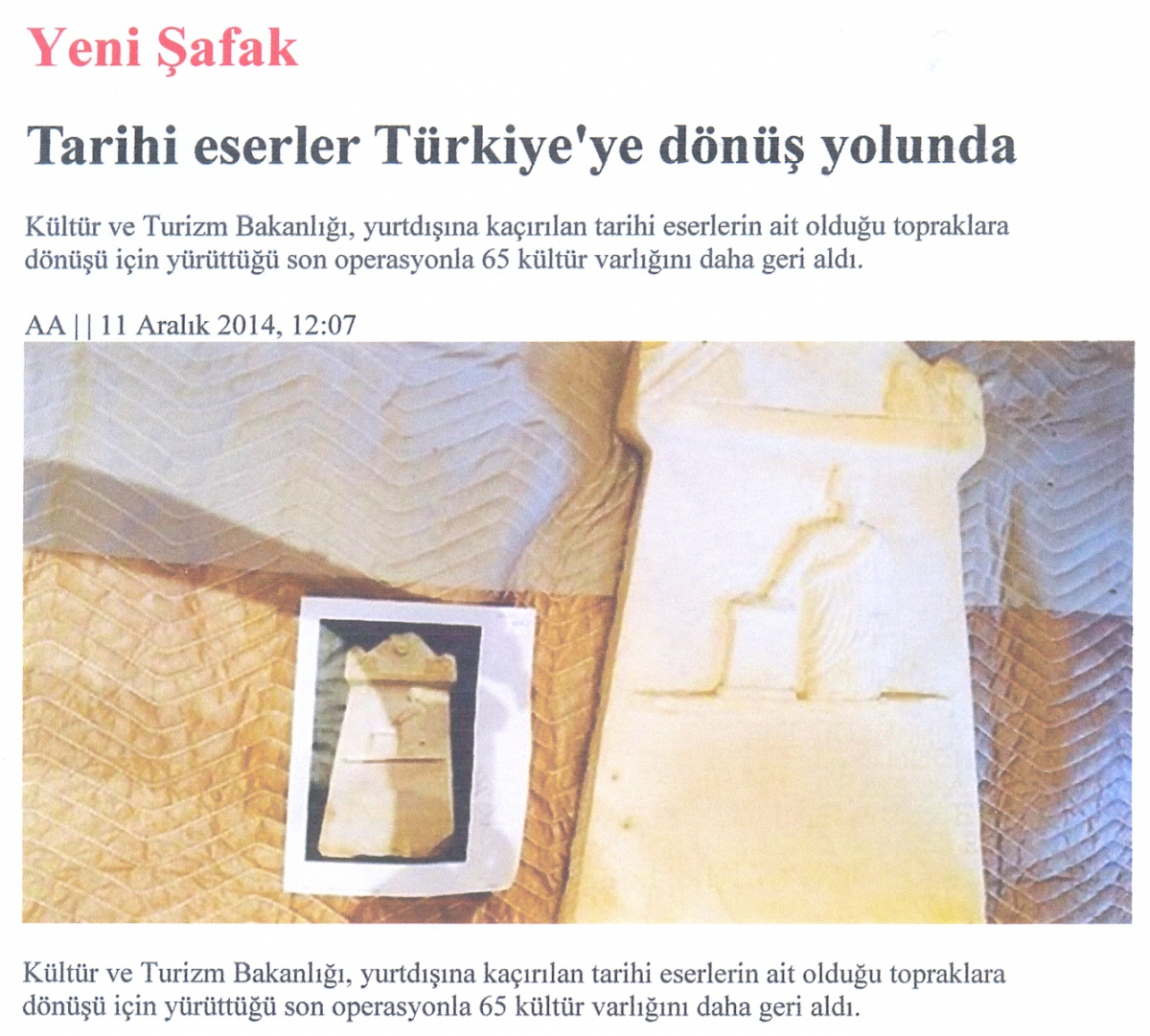 Σύμφωνα με ανακοίνωση του τουρκικού υπουργείου Πολιτισμού και Τουρισμού, άλλα 65 μεγάλης πολιτιστικής, ιστορικής και αρχαιολογικής αξίας αντικείμενα που είχαν κλαπεί από την Μικρά Ασία, επιστραφήκαν πρόσφατα στην… «πατρίδα» τους την Τουρκία. Συνολικά μέσα στο 2014 ογδόνταένα αντικείμενα που βρίσκονταν στο εξωτερικό, κυρίως σε ξένα μουσεία, κατόπιν πρωτοβουλιών και έντονης πίεσης της τουρκικής πλευράς επεστράφησαν πίσω και τώρα φιγουράρουν σε τουρκικά μουσεία ενώ οι Τούρκοι τρίβουν τα χέρια τους από την τουριστική εκμετάλλευση τους που αναμένεται να τους φέρει άφθονο συνάλλαγμα στα ταμεία τους. Όπως ανέφερε το τουρκικό προξενείο της Νέας Υόρκης, 48 αρχαία βέλη, ένα πολύτιμης αξίας δαχτυλίδι, μια χάλκινη ζώνη βυζαντινής εποχής και δεκαπέντε αρχαία νομίσματα, τα οποία φυσικά έχουν ελληνικές επιγραφές, είναι το τελευταίο απόκτημα της Τουρκίας καθώς παραδόθηκαν ήδη στις τουρκικές αρχές.
