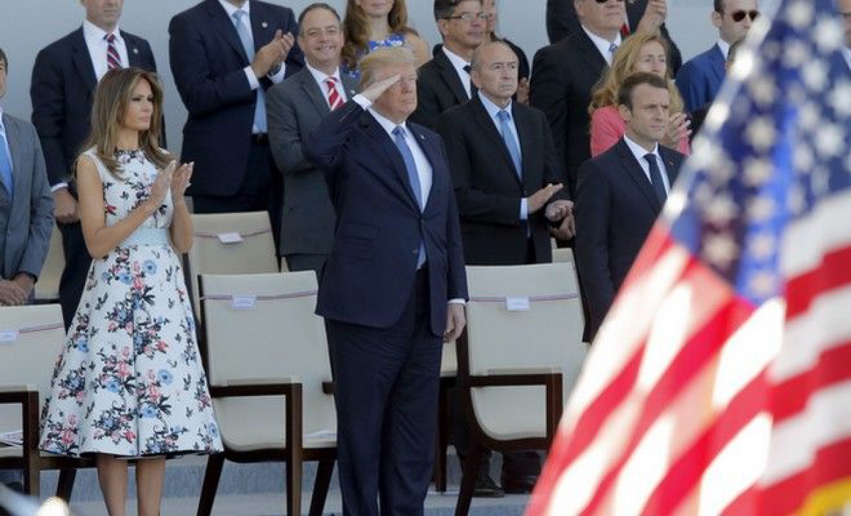 Κατά την παρέλαση, οι δύο αρχηγοί κρατών κάθισαν μαζί σε μια εξέδρα χειροκροτώντας, δείχνοντας και ακουμπώντας ο ένας τον άλλο στο μπράτσο καθώς υπερίπταντο στρατιωτικά αεροσκάφη. Ο Τραμπ χαιρέτισε στρατιωτικά καθώς στρατιωτικό προσωπικό --μερικοί φορώντας στολές του Πρώτου Παγκόσμιου Πολέμου-- παρήλαυνε με φόντο την Αψίδα του Θριάμβου.