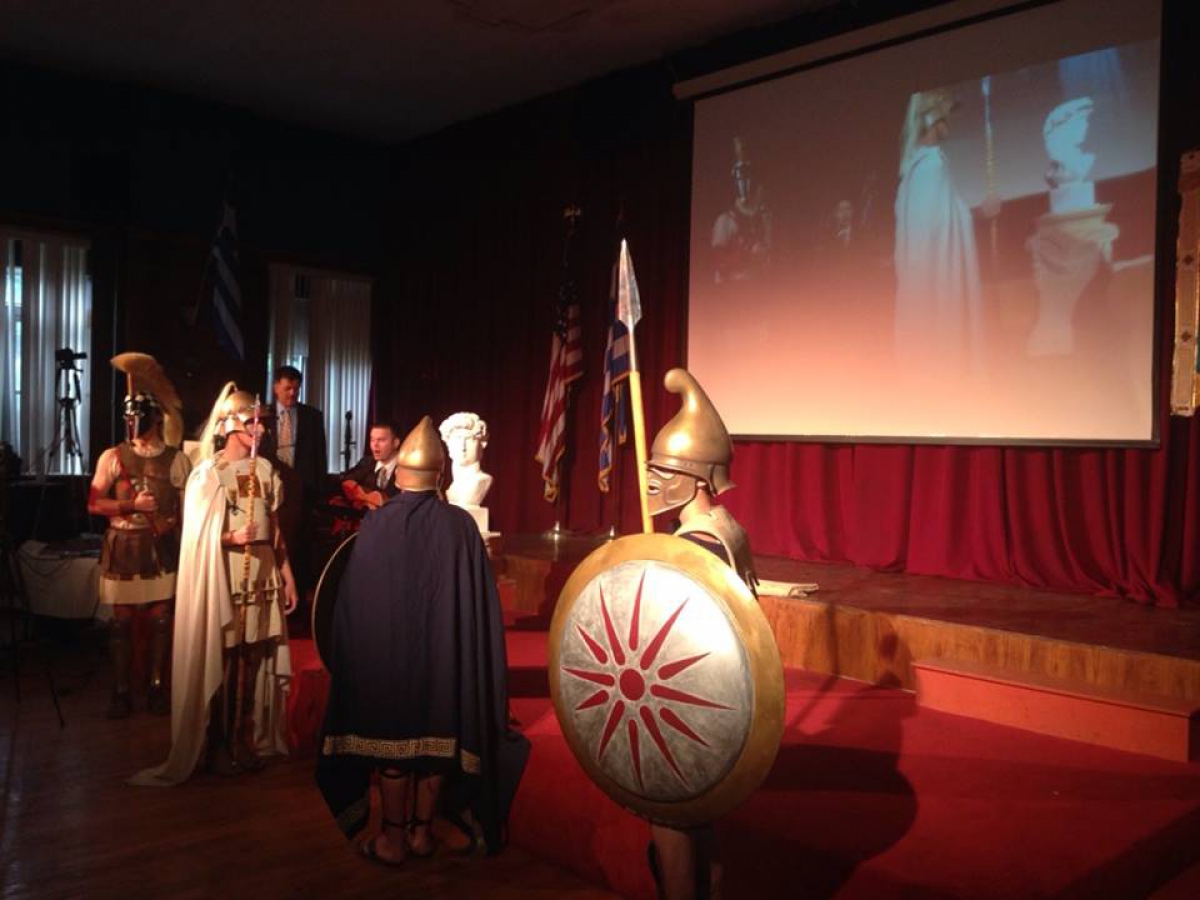 Η εκδήλωση ξεκίνησε με ένα εντυπωσιακό τελετουργικό από τέσσερις νέους ντυμένοι με αρχαίες μακεδονικές στολές υπό τους ήχους γνωστού τραγουδιού για την Μακεδονία.