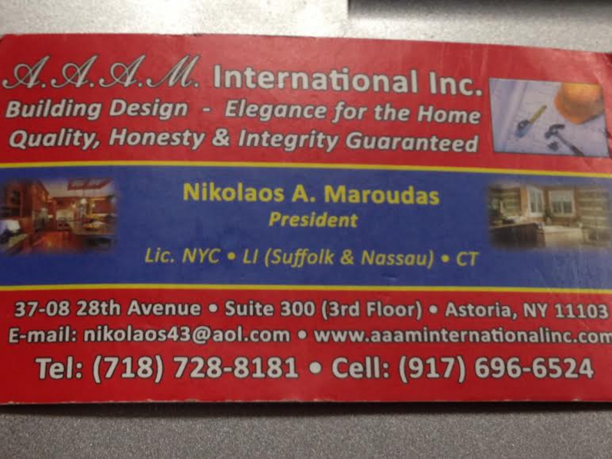 Ο Νίκος Μαρούδας, αρχιτέκτονας με εμπειρία 30 ετών, προσφέρει τις πολύτιμες συμβουλές του σε χαμηλό κόστος για όλους όσους θέλουν να έχουν ησυχο το κεφάλι τους. Ειδικότερα, το αρχιτεκτονικό γραφείο του Νίκου Μαρούδα, εγγυάται ότι μπορεί να σας δώσει απαντήσεις σε όλα τα θέματα που σας απασχολούν όσον αφορά το κτίριο σας, ενώ ταυτόχρονα σας βοηθάει με ειδικές εμπεριστατωμένες μελέτες να νομιμοποιήσετε τις αυθαιρεσίες και τις παραβάσεις σας. Ο κ. Μαρούδας και το έμπειρο προσωπικό του γραφείου InternationalIncorporated μπορούν να σας εξασφαλίσουν όλες τις άδειες που απαιτούνται και χρειάζεστε ώστε να είστε νόμιμοι, ενώ θα απαντήσουν με ειλικρίνεια, υπευθυνότητα και συνέπεια σε κάθε ερώτηση που έχετε. Επίσης το γραφείο InternationalIncorporated αναλαμβάνει ακόμα όλες τις οικοδομικές εργασίες σας πάντα με πλήρη επαγγελματισμό. Η Διεύθυνση του γραφείου του Νίκου Μαρούδα είναι στο 37-08 στην 28η Λεωφόρο στην Αστόρια με τηλεφωνο 718 728 8181.