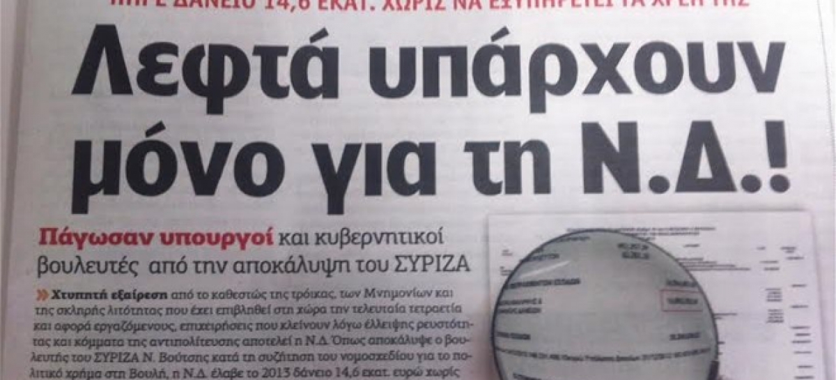 «Η επιχείρηση λάσπης του ΣΥΡΙΖΑ συνεχίζεται με αμείωτο ρυθμό. Σειρά πήρε σήμερα το κομματικό τους έντυπο, η Αυγή, που με πρωτοσέλιδο άρθρο της, συκοφαντεί τη Ν.Δ. για δήθεν δάνειο που έλαβε το 2013, ύψους 14,6 εκ. Ευρώ. Καλούμε τους λασπολόγους του ΣΥΡΙΖΑ και της “Αυγής”, εντός της ημέρας να “τεκμηριώσουν” στον Ελληνικό λαό το δημοσίευμά τους, δηλαδή το ύψος του δανείου που “έλαβε” η Ν.Δ., πότε ελήφθη και από ποια τράπεζα. Διαφορετικά θα επιβεβαιώσουν ότι είναι πολιτικοί εμπρηστές και αισχροί συκοφάντες, που στην απόπειρά τους να αποσταθεροποιήσουν τη χώρα δεν διστάζουν ακόμα και να κατασκευάζουν στοιχεία.